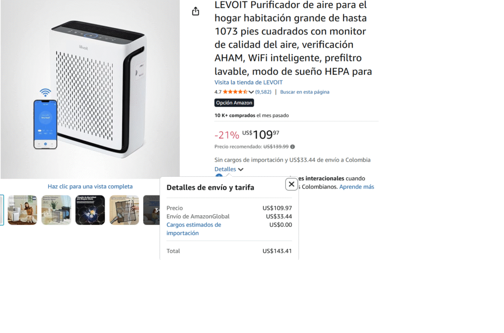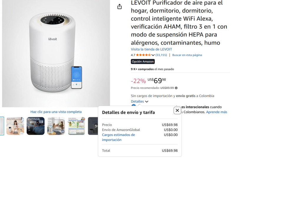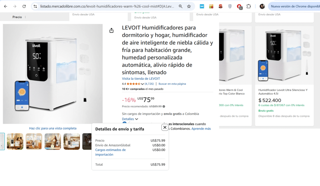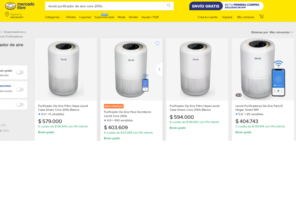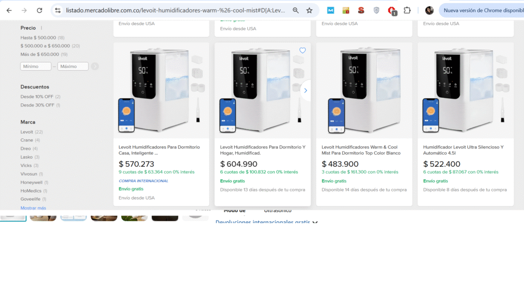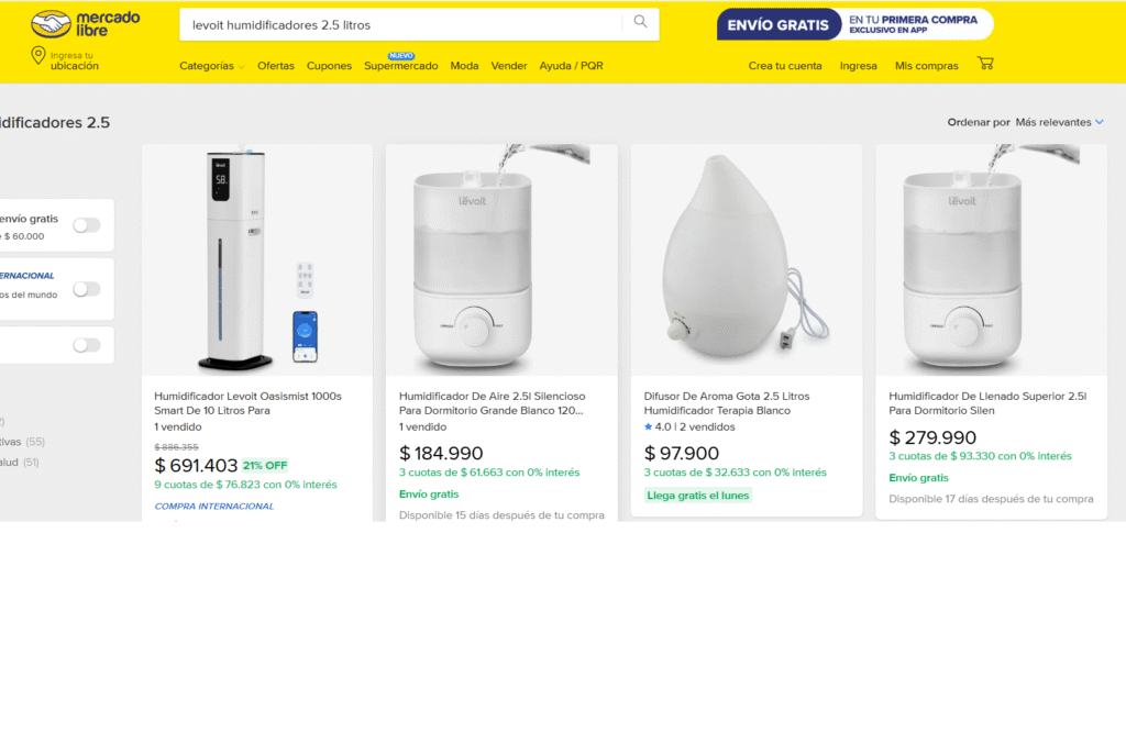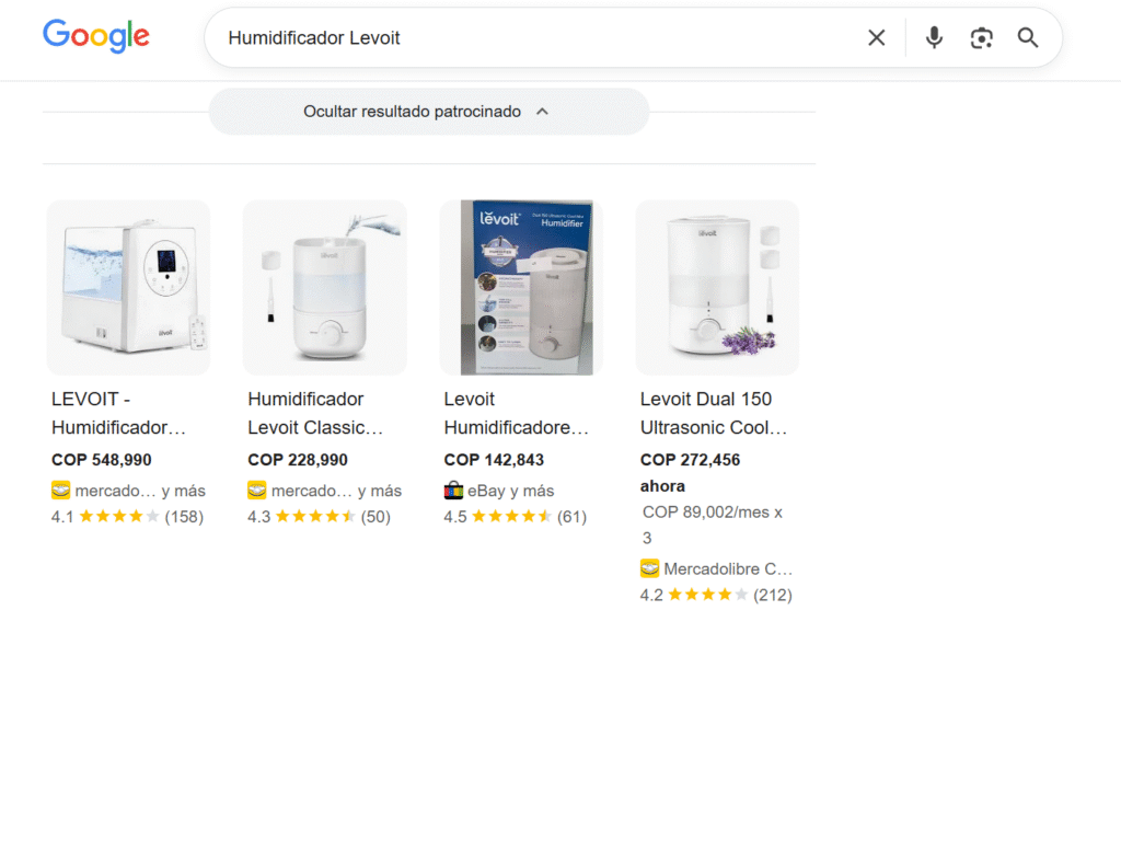 Si realizas la búsqueda en Google por “Humidificador Levoit”, encontrarás nuestro modelo estrella, destacado por ser el más vendido. Sus precios rondan entre $184.990 (el producto más económico encontrado) y $272.456 en pesos colombianos. Aunque nuestro producto afiliado suele estar entre $220.000 y $245.000, la mayoría del tiempo encontrarás descuentos que reducen su precio.