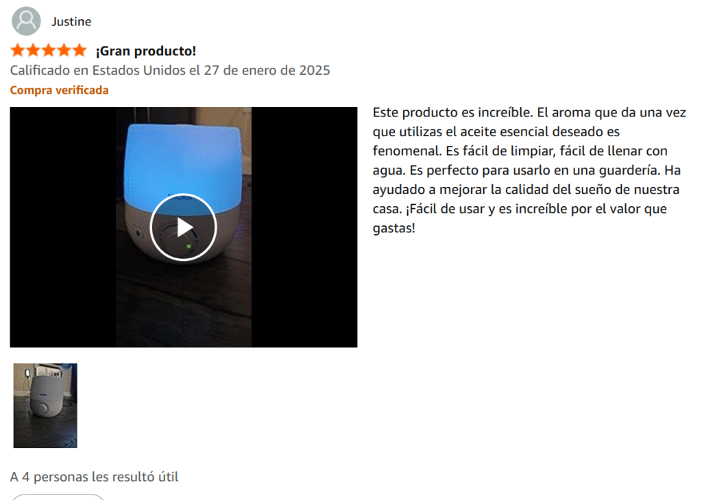 Este producto es increíble. El aroma que da una vez que utilizas el aceite esencial deseado es fenomenal…….