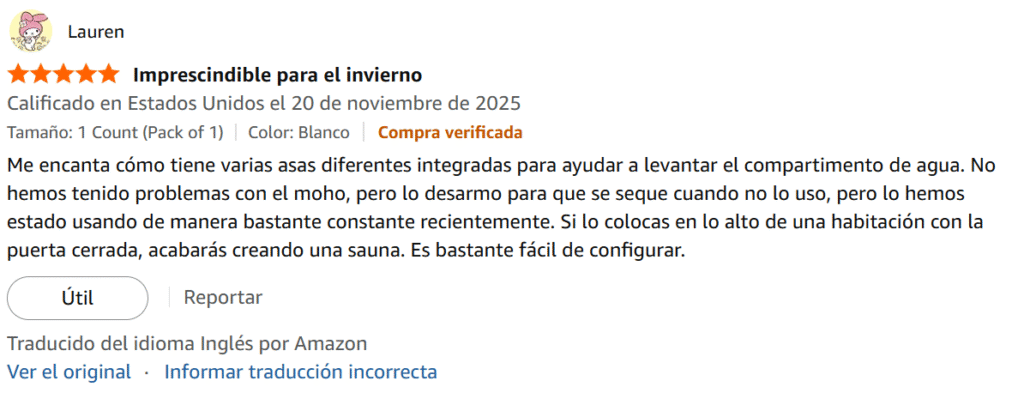 Me encanta cómo tiene varias asas diferentes integradas para ayudar a levantar el compartimento de agua. No hemos tenido problemas con el moho…….